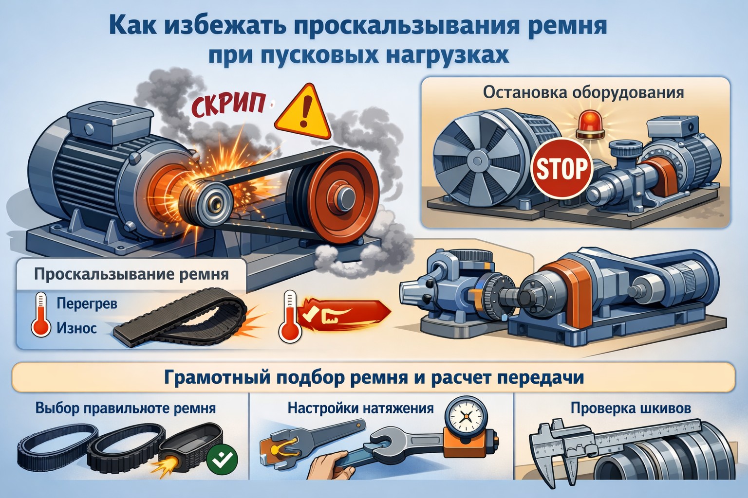 Проскальзывание приводного ремня в момент запуска двигателя или при резком увеличении нагрузки — распространенная проблема, которая приводит к снижению эффективности передачи мощности, перегреву и ускоренному износу как самого ремня, так и шкивов. Этот процесс особенно опасен при высоких пусковых моментах, характерных для промышленного оборудования: насосов, вентиляторов, компрессоров. Проскальзывание не только снижает производительность, но и создает риски внезапной остановки технологического процесса. Предотвращение этого явления требует комплексного подхода, включающего правильный выбор ремня, точную настройку передачи и контроль условий эксплуатации.