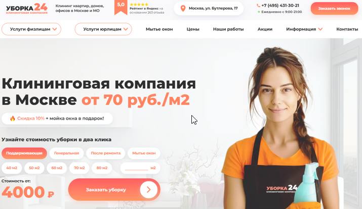 - Услуги: поддерживающая уборка, генеральная, после ремонта, мойка окон, химчистка.