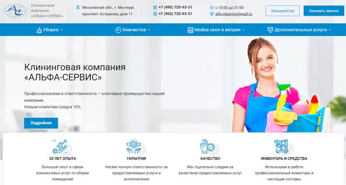 - Услуги: поддерживающая, генеральная, уборка после ремонта, химчистка, мойка окон, уборка офисов, дезинфекция и озонирование.
