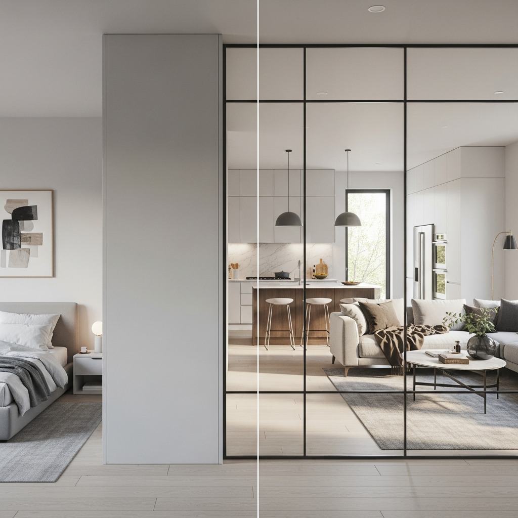 Стеклянные перегородки — тренд в современных интерьерах, особенно в студиях, лофтах и квартирах с нехваткой естественного света.