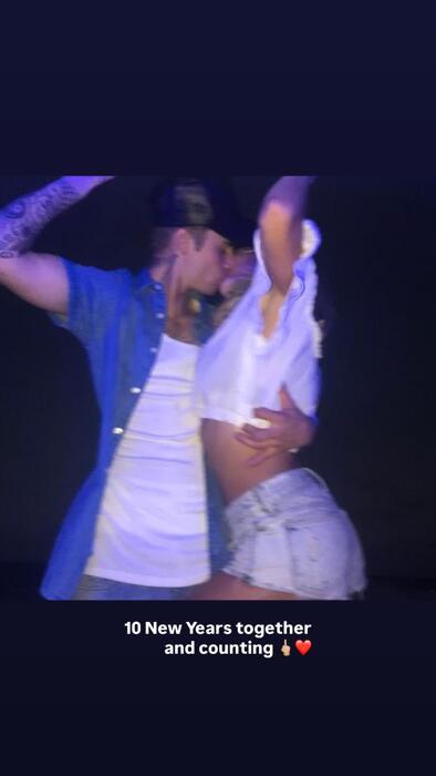 Топ-модель Хейли Бибер и её супруг Джастин Бибер минувшей ночью отметили не только наступление нового года, но и важную личную дату. В этот день звездная пара праздновала десять лет совместной жизни. В честь столь знаменательного события 27-летняя модель обнародовала трогательный снимок, на котором запечатлен их страстный поцелуй с мужем, сделанный во время новогодних торжеств.