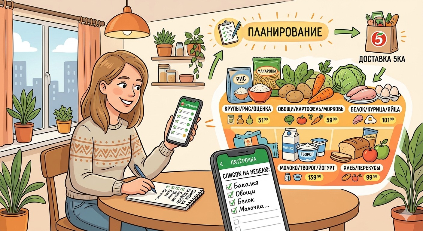 Главная проблема спонтанных покупок – разрозненность. Человек заходит в магазин за молоком, а выходит с пакетом случайных товаров. Когда же покупки планируются заранее, структура корзины становится логичной: есть база для завтраков, продукты для обедов и ужинов, а также небольшой запас перекусов.