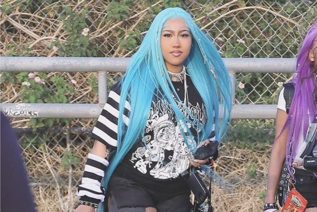 На фестивале Норт Уэст была замечена в компании друзей. Наследница знаменитостей предстала перед камерой в черной футболке с белым принтом, шортах и массивных ботинках. Образ дополнили чокер с шипами и окрашенные в голубой цвет волосы.