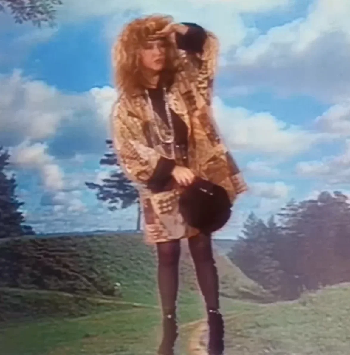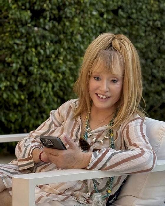 На одном из снимков 76-летняя артистка запечатлена в джинсах, серебристых кедах и розовой вязаной кофте. Поверх наряда звезда надела куртку с принтом из различных лоскутов ткани. Пользователи Сети отметили, что в 1989 году исполнительница снималась в плаще из похожего материала в клипе «Фотограф».