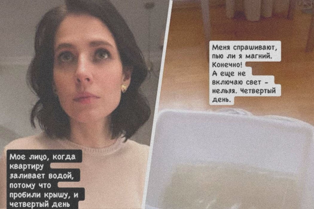 «Мое лицо, когда квартиру заливает водой, потому что пробили крышу, и четвертый день не хотят чинить. Меня спрашивают, пью ли я магний. Конечно! А еще не включаю свет — нельзя. Четвертый день», — поделилась артистка.