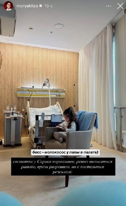 «Состояние у Сарика нормальное, решил выписаться раньше, врачи разрешили, но с постельным режимом», — сообщила Лиза Моряк в своих сторис. Она также опубликовала в Сети фотографию дочери в палате отца.