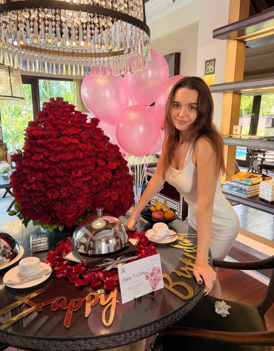 К своему праздничному посланию 27-летняя бизнесвумен прикрепила яркий снимок. На фото Александра позирует в белом облегающем платье, без макияжа, на фоне роскошного букета алых роз, воздушных шаров и накрытого праздничного стола.